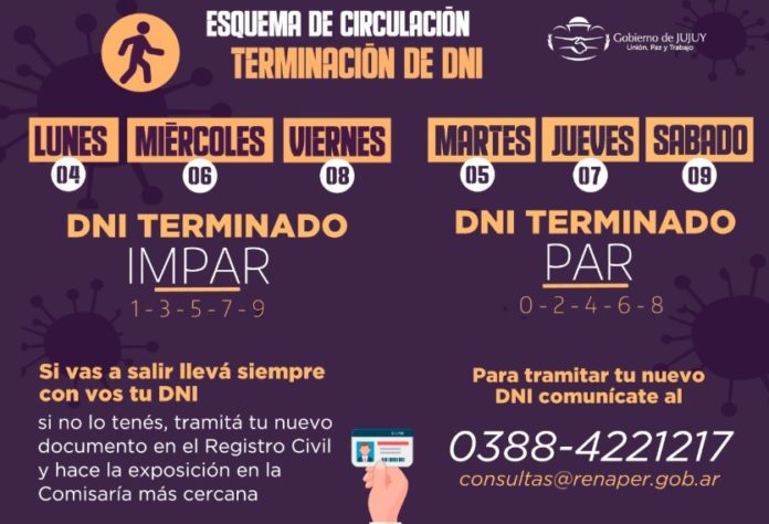 En tanto, los días martes 5, jueves 7 y sábado 9, podrán circular las personas con DNI par y con terminación 0.