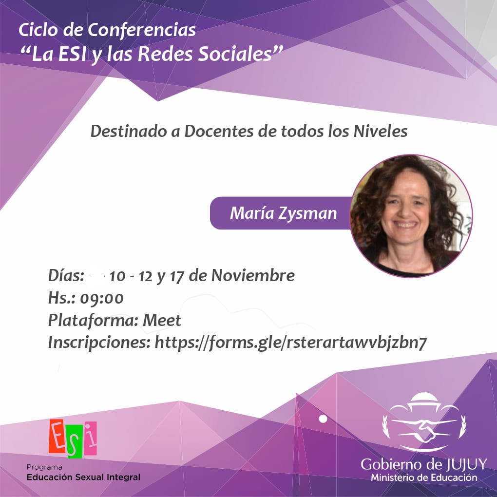 La Secretaría de Equidad Educativa del Ministerio de Educación de Jujuy, invitó a docentes de todos los niveles educativos, a participar de los encuentros virtuales del Ciclo de Conferencias “La ESI y las Redes sociales”.