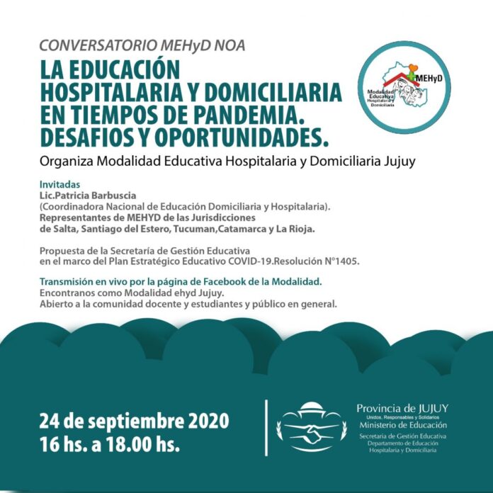 El Ministerio de Educación de Jujuy invita a la comunidad docente, estudiantes y público en general a participar del Conversatorio “La Educación Hospitalaria y Domiciliaria en tiempos de pandemia. Desafíos y Oportunidades”, organizado por la Modalidad Educativa Hospitalaria y Domiciliaria de la provincia para todo el NOA.