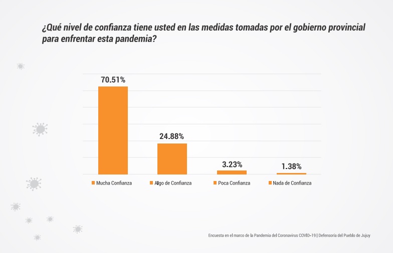 Según las respuestas de los encuestados, un 90.8% afirmó tener mucha o algo de confianza en las medidas tomadas a nivel nacional para enfrentar la pandemia, mientras que un 95.4% dijo tener mucha o algo de confianza en las medidas tomadas a nivel provincial.