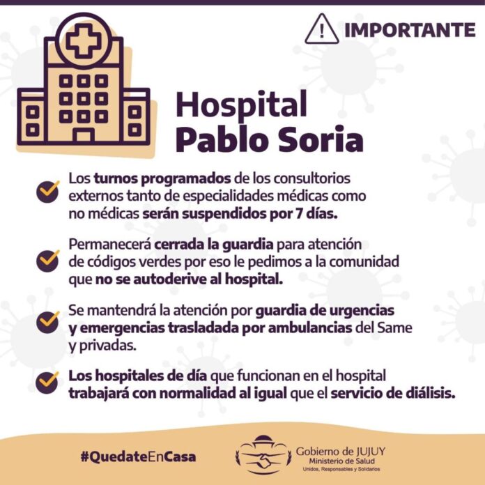 En cuanto al Hospital “Pablo Soria”, reiteró a la población que “no concurra voluntariamente, ya que la Guardia de códigos verdes permanecerá cerrada y sólo se realizará un triage mediante el cual los pacientes serán derivados a los Nodos o Guardias 24 horas”.